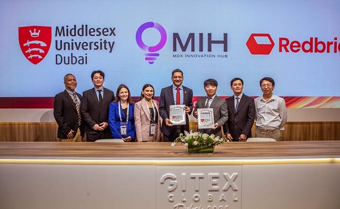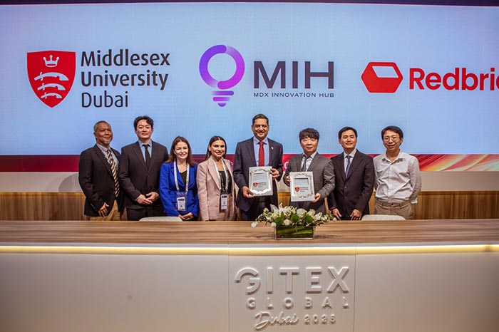 The signing ceremony was attended by Professor Cedwyn Fernandes, Pro-Vice Chancellor of Middlesex University and Director of MDX Dubai; Professor Fehmida Hussain, Deputy Director of MDX Dubai and Head of MIH; Doctor Jeongsoo Han and Doctor Engie Bashir, Co-Chairs of MIH; as well as Redbrick CEO Yeongmo Yang and Co-founder Kwangyong Lee.